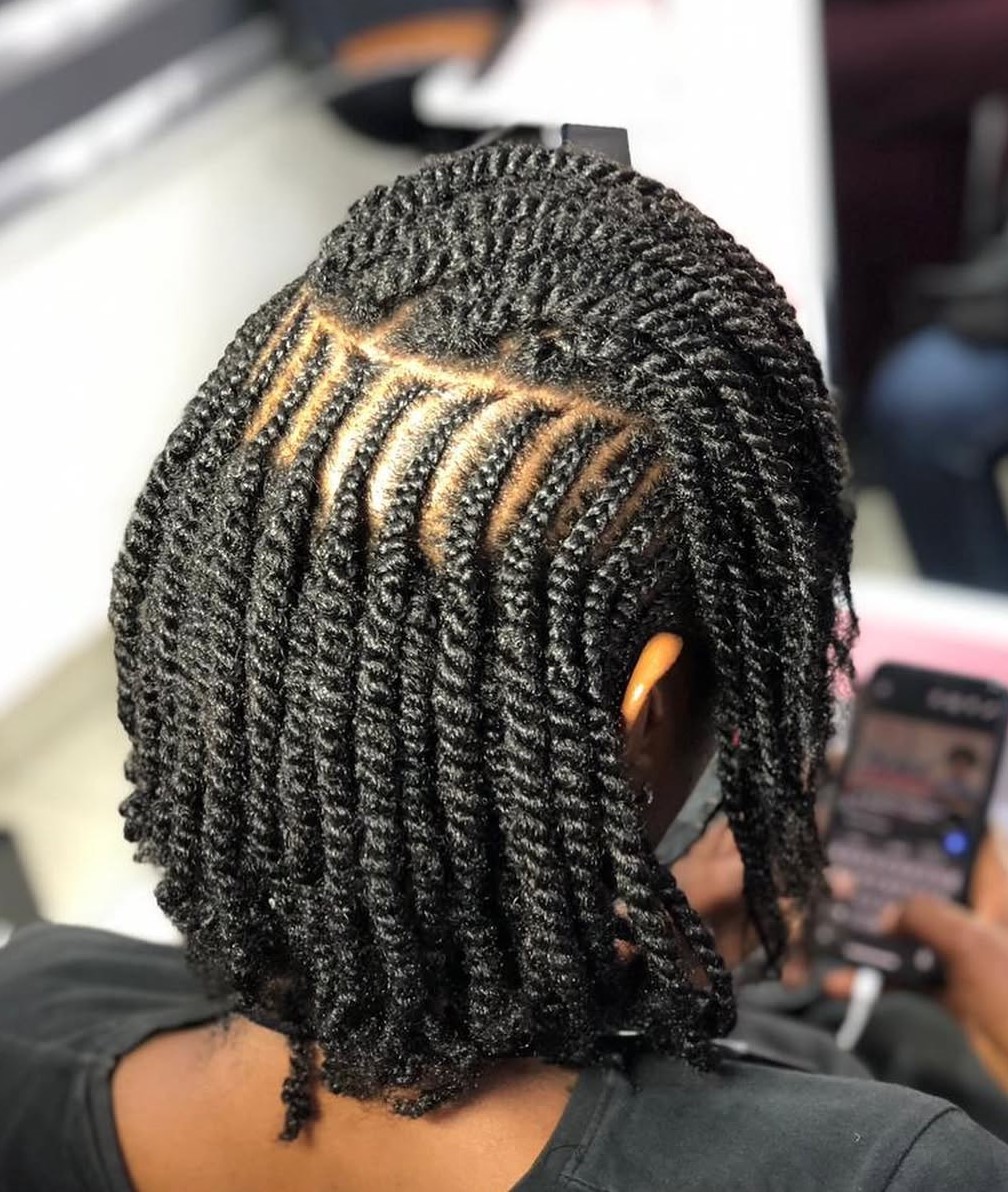 The combination of scalp braids and bouncy twisted bob is the ultimate dream, whether you twist your natural hair or add extensions! The accurate twists and mini cornrows can make your natural curls more manageable and reduce frizz. All you need is to apply moisturizer to your dry hair before twisting it to hydrate and nourish your curls.