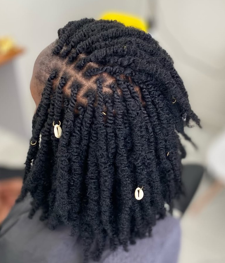 If you’re wondering how to style your twists, you’re in luck because this hairstyle is very simple to recreate. Once you have your hair in thick twists, add a few beads to pieces around your face. Next, take the front sections of your hair and wrap them around to form a bun very close to your hairline. Secure with bobby pins.
