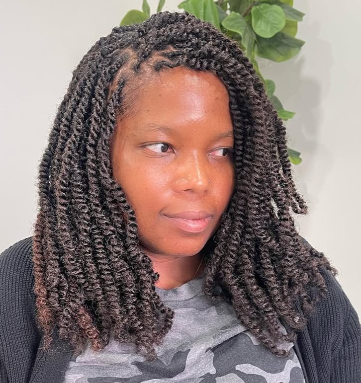 Rocking lovely ringlets at the ends of your twists is an easy way to personalize your style and add it a romantic note. Simply place your twists on roller rods and dip the ends into a bowl of hot water. The result is the two-strand twists with curls, and the best part is that you don’t have to worry about them falling flat or frizzing!