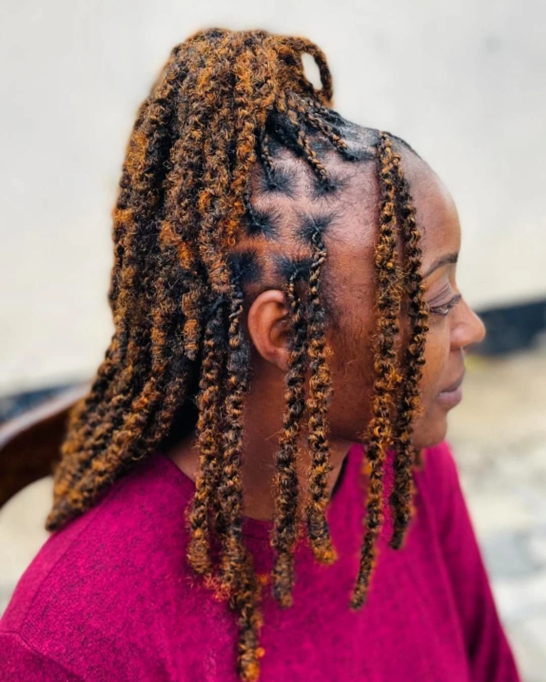 Express your creativity and individuality through diverse styling options and color combinations! If you’re not a big fan of intricate styles, stop at the last, and enhance the visual impact of your twists with the rich caramel hue.