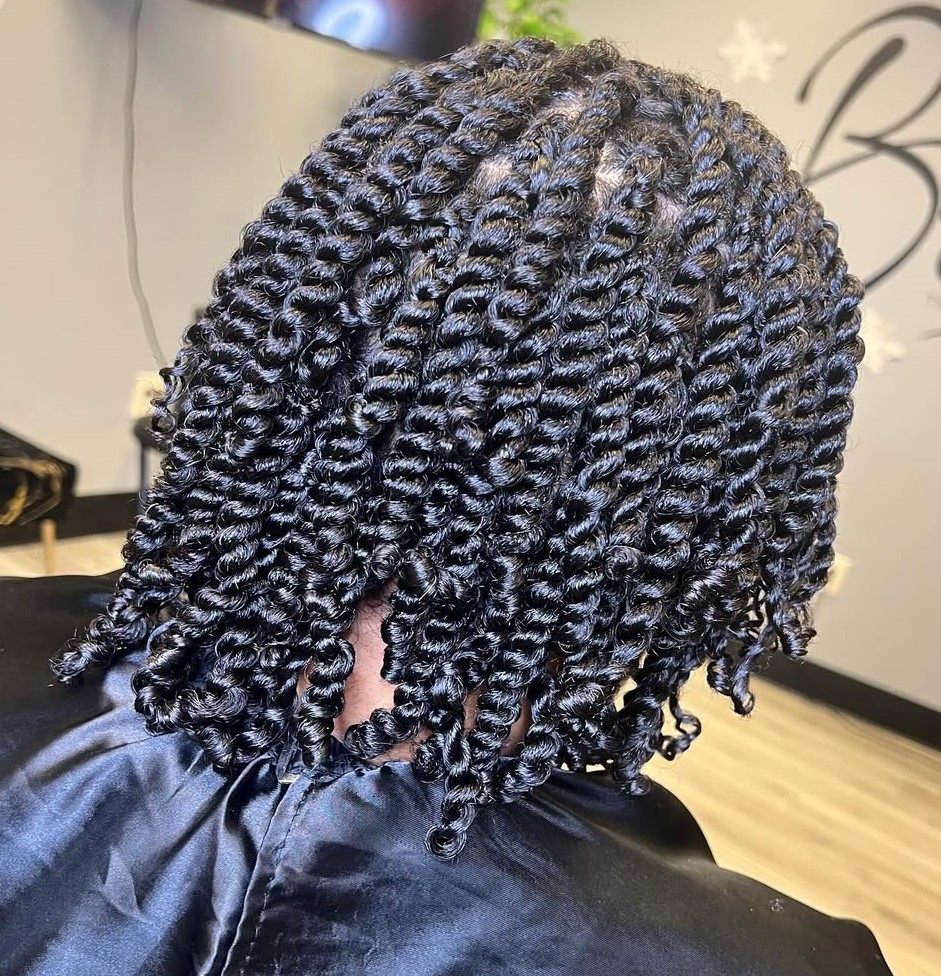 Rocking lovely ringlets at the ends of your twists is an easy way to personalize your style and add it a romantic note. Simply place your twists on roller rods and dip the ends into a bowl of hot water. The result is the two-strand twists with curls, and the best part is that you don’t have to worry about them falling flat or frizzing!