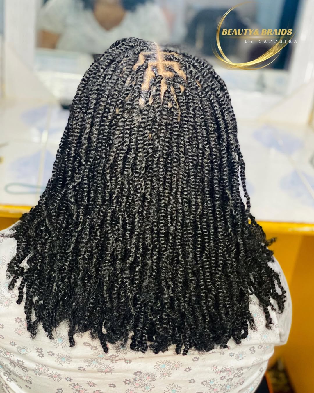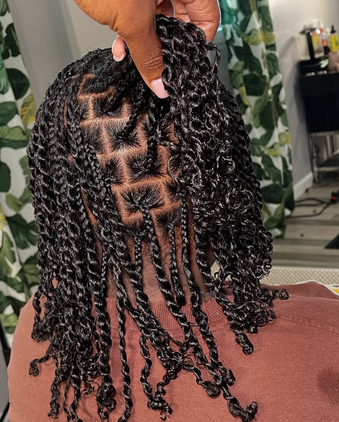 The combination of scalp braids and bouncy twisted bob is the ultimate dream, whether you twist your natural hair or add extensions! The accurate twists and mini cornrows can make your natural curls more manageable and reduce frizz. All you need is to apply moisturizer to your dry hair before twisting it to hydrate and nourish your curls.