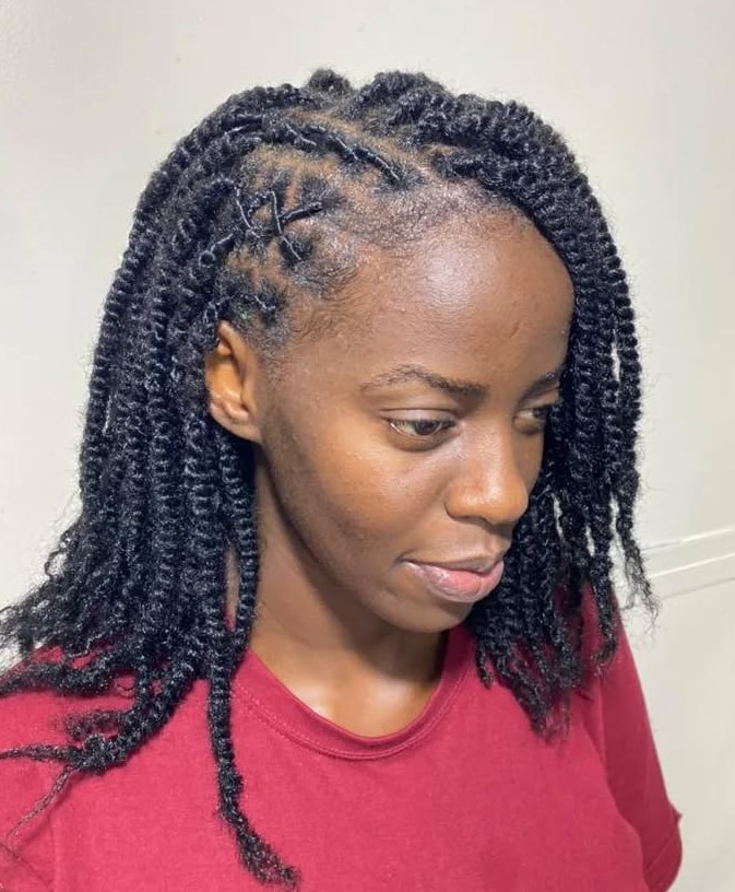 Having natural hair opens up a world of styling possibilities, and twists are a fantastic choice for protecting your strands and showcasing your style. Craft criss-cross cornrows and blend them with elegant twists, locking in the style with a light-hold hairspray for a polished finish.