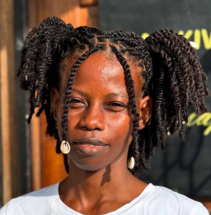 The half-up bun is a popular hairstyle. If you’re looking for a fun take on the look, try it with twisted hair. To make more of a statement, accessorize a few random twists with beads. The beads around the face also help to accentuate the smile and add a playful twinkle to the eyes.