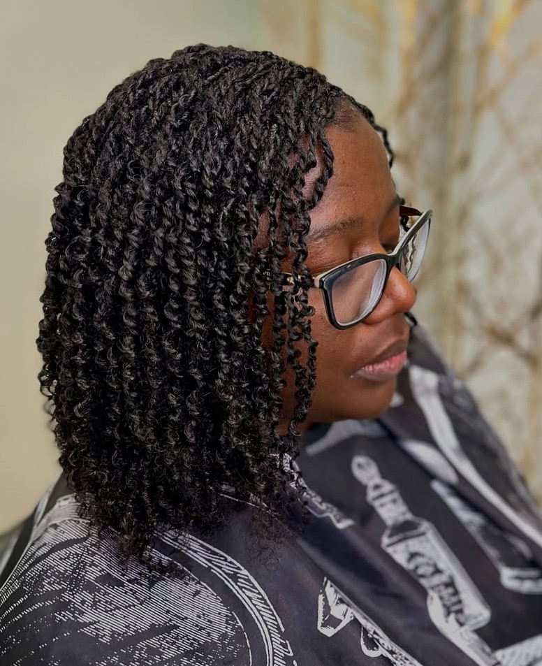 Rocking lovely ringlets at the ends of your twists is an easy way to personalize your style and add it a romantic note. Simply place your twists on roller rods and dip the ends into a bowl of hot water. The result is the two-strand twists with curls, and the best part is that you don’t have to worry about them falling flat or frizzing!