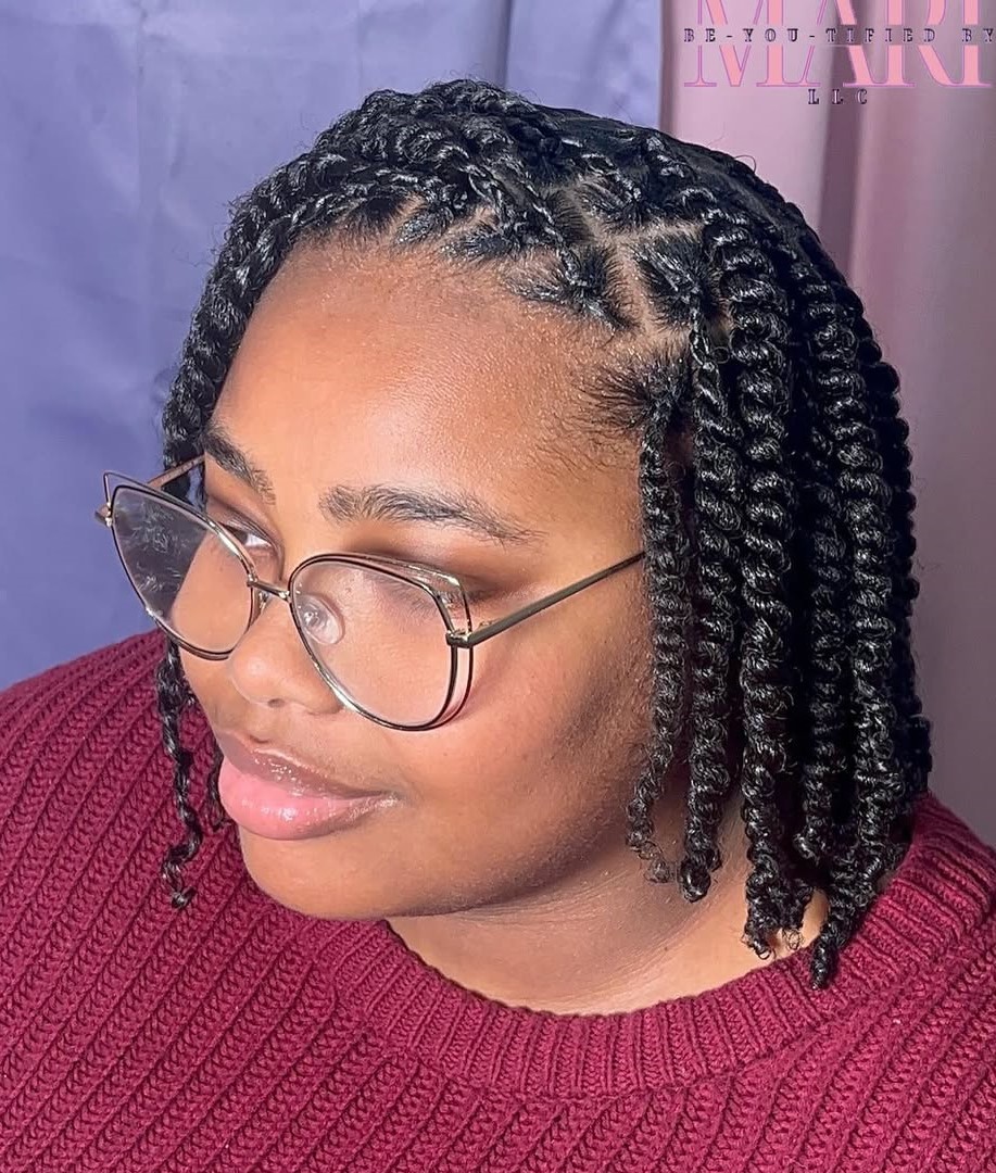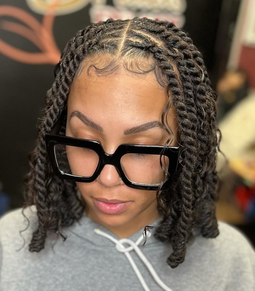 The combination of scalp braids and bouncy twisted bob is the ultimate dream, whether you twist your natural hair or add extensions! The accurate twists and mini cornrows can make your natural curls more manageable and reduce frizz. All you need is to apply moisturizer to your dry hair before twisting it to hydrate and nourish your curls.