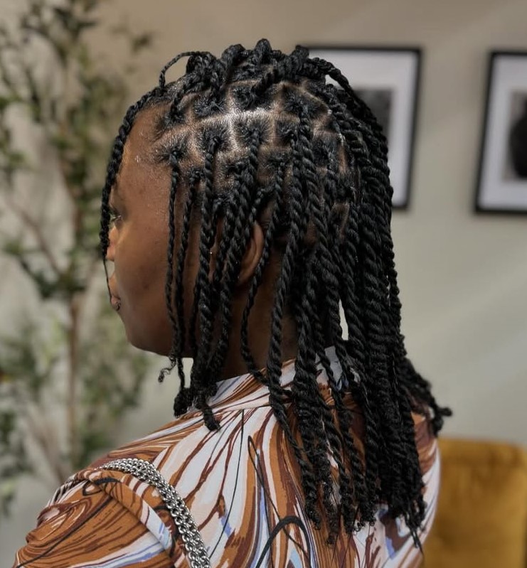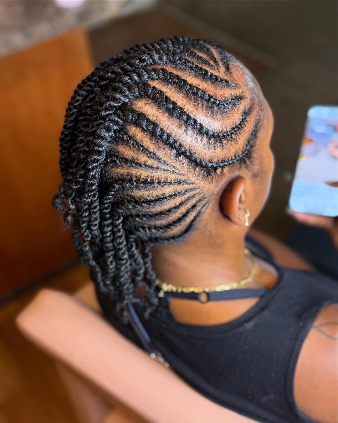 Having natural hair opens up a world of styling possibilities, and twists are a fantastic choice for protecting your strands and showcasing your style. Craft criss-cross cornrows and blend them with elegant twists, locking in the style with a light-hold hairspray for a polished finish.