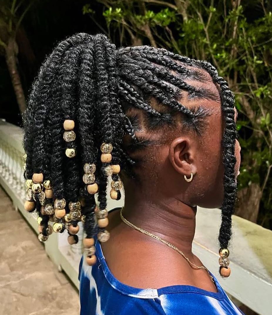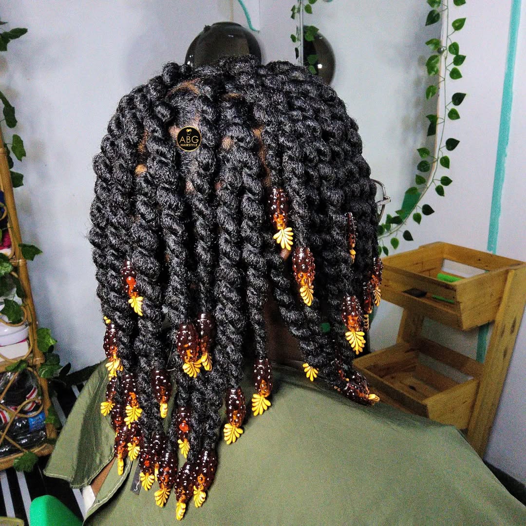 If you’re wondering how to style your twists, you’re in luck because this hairstyle is very simple to recreate. Once you have your hair in thick twists, add a few beads to pieces around your face. Next, take the front sections of your hair and wrap them around to form a bun very close to your hairline. Secure with bobby pins.