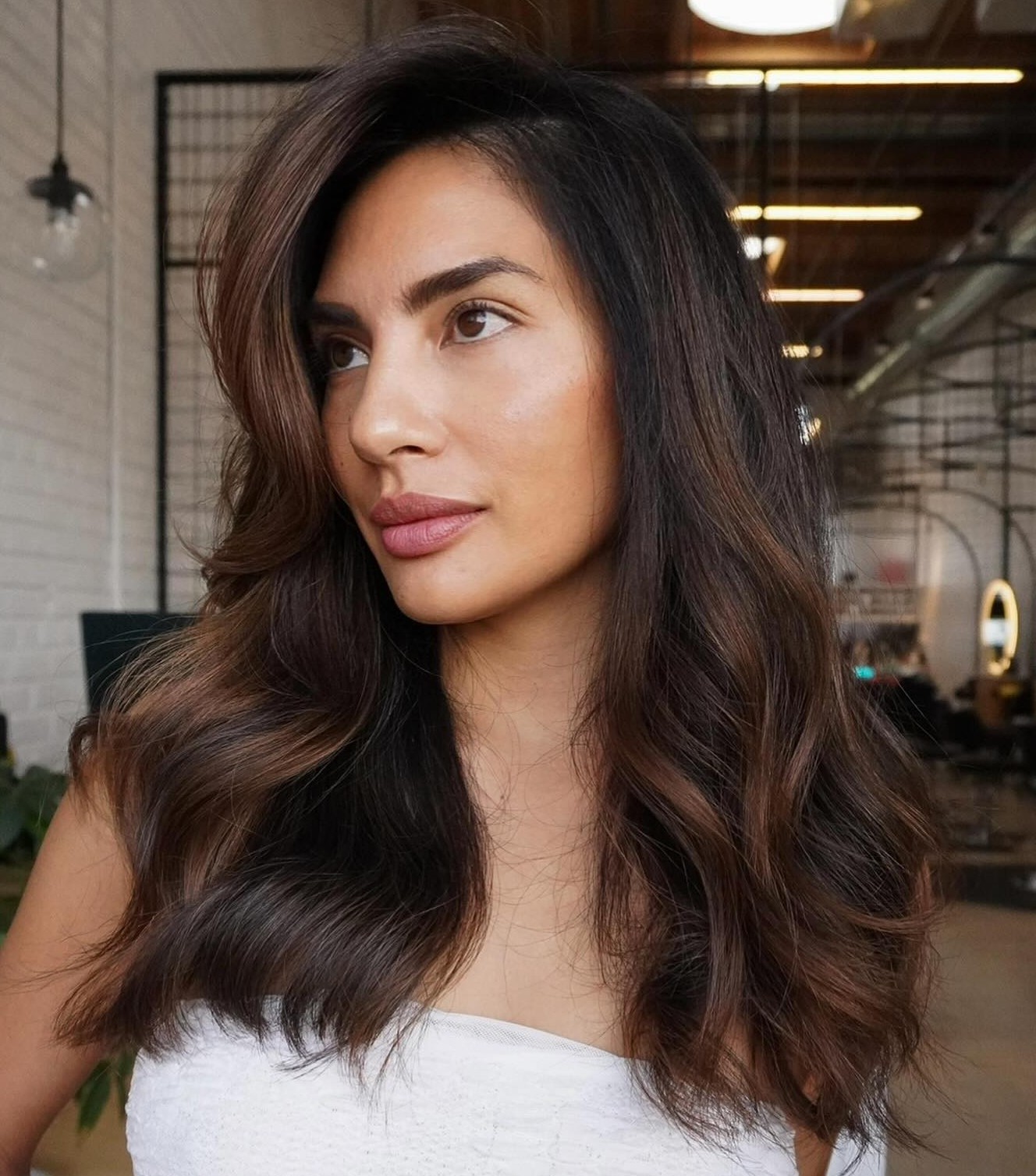 These gorgeous colors are a perfect way to do cool-toned dark chocolate hair with highlights. Ask your stylist for a medium cut with just a few chin-length layers. You’ll have so many modern ways to style this cut: perfectly straight, curled under layers, or large waves.