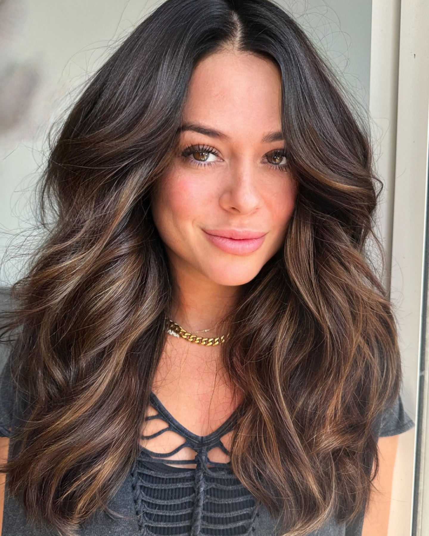 Want to refresh the color of your long brown hair? Try a subtle balayage. The warm chocolate tones look incredibly silky on wavy locks, and the lighter color brings a hint of summer to your style.