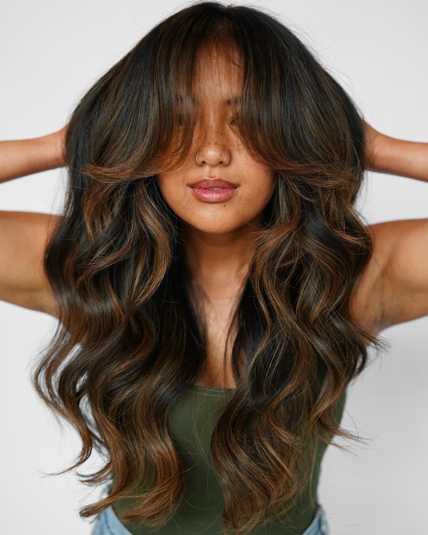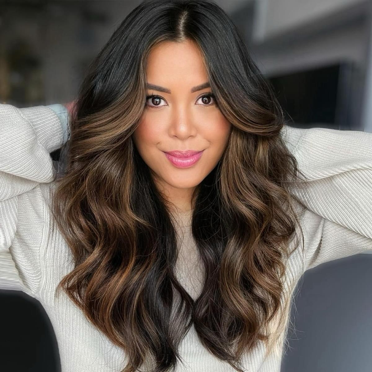 Running low on hair color ideas for brunettes? If you gravitate towards warmer shades, the glowy tint in rose gold chocolate highlights is a great bet! Start them lower down from the roots and show off the dimension of your dye job styling loose flowy curls.