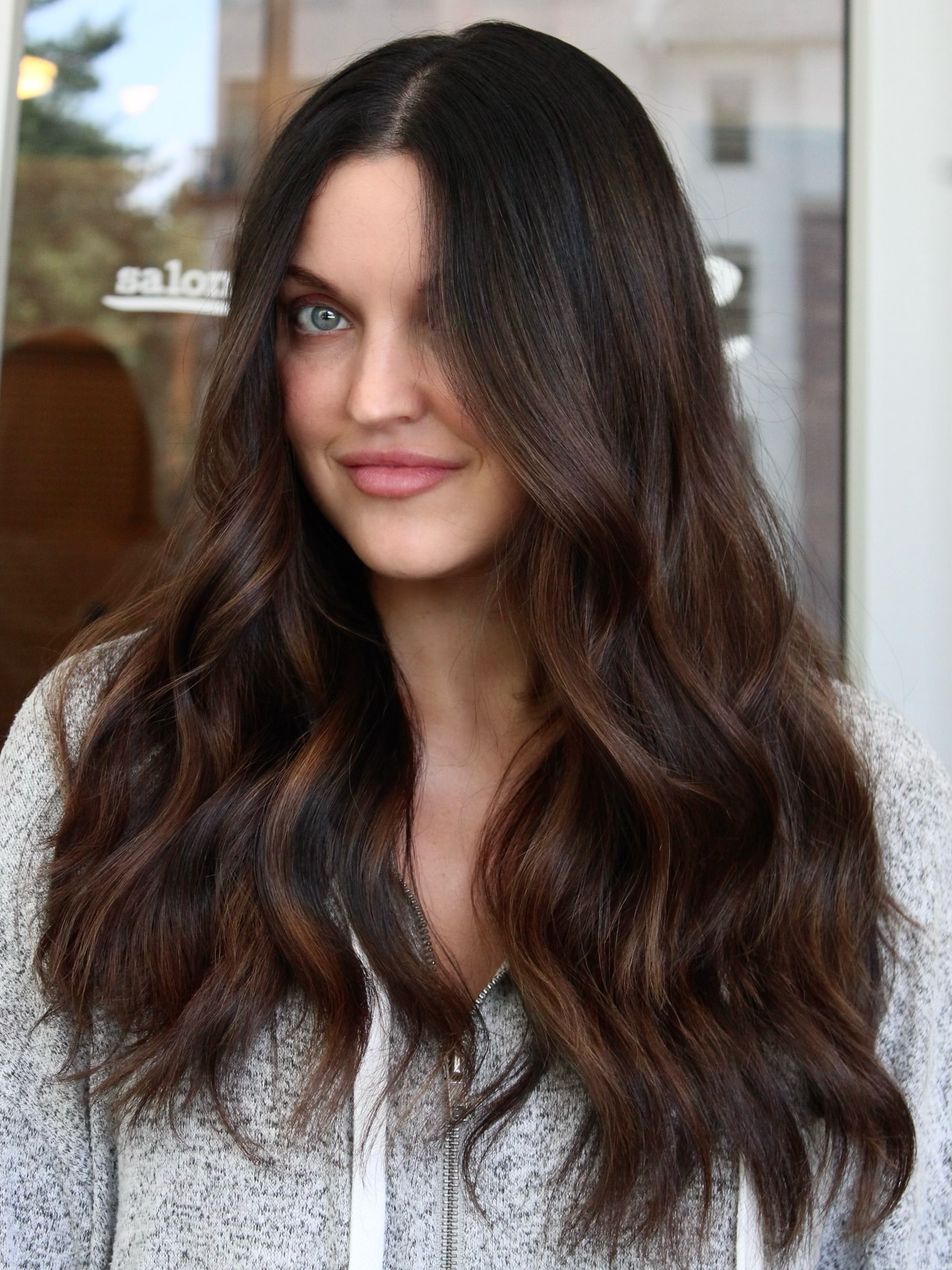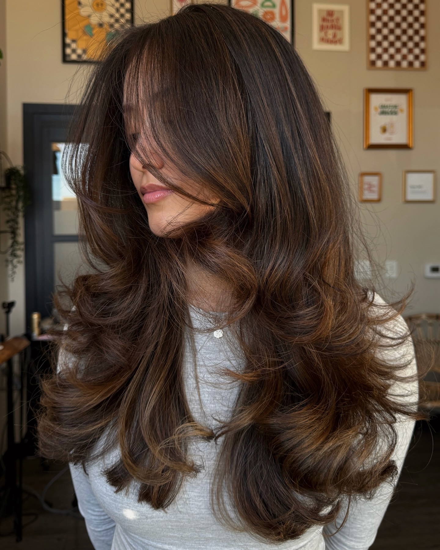 A warm brown hair color painted delicately as balayage concentrated towards the ends of layered hair is a fantastic technique to consider when changing up your look. Perfect for seasonal updates! Highlight the delicate hand-painted work by big, voluminous waves.