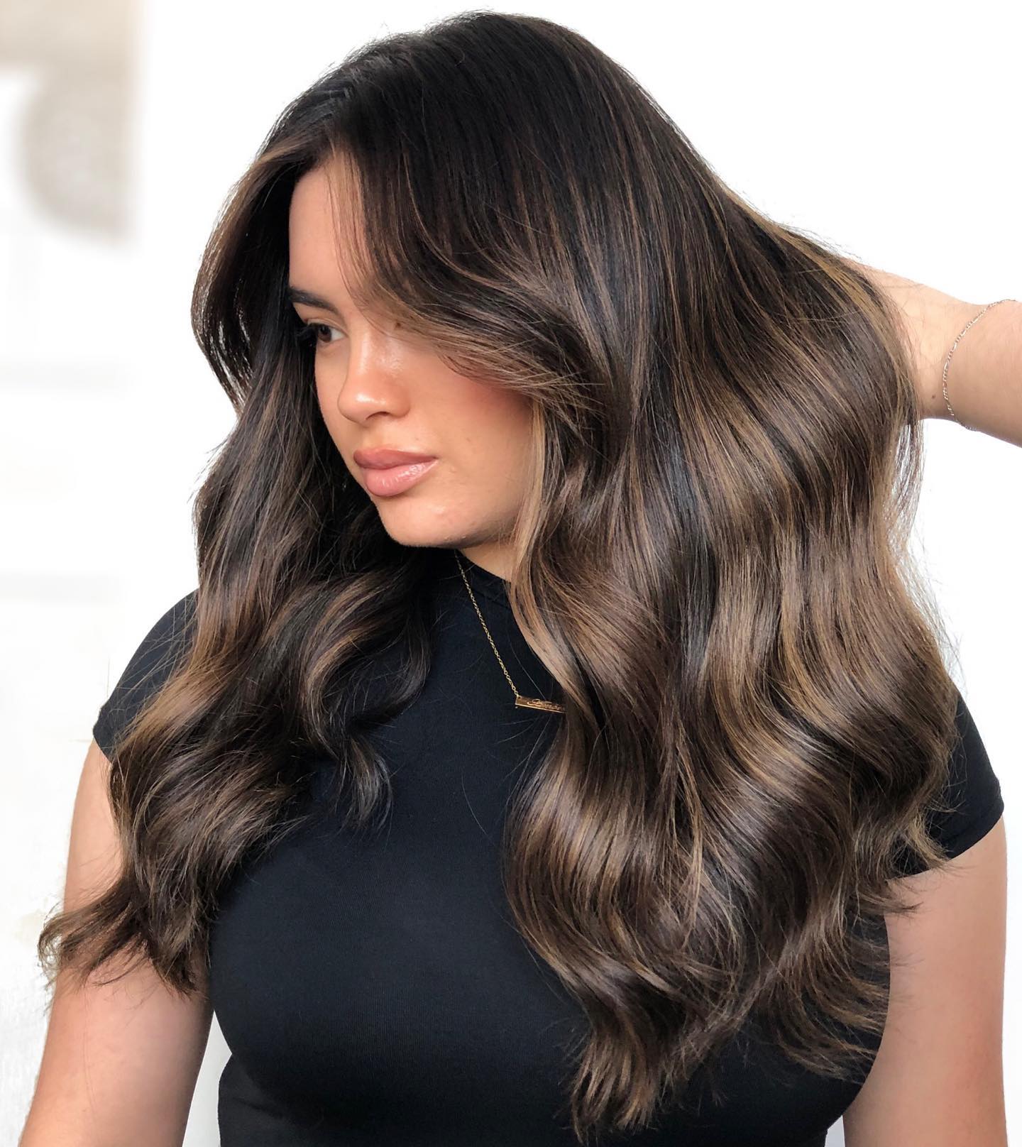 A fabulous way to add some warmth to your tresses is through a subtle balayage. Chocolate highlights suit those with warm skin undertones beautifully and they soften up cooler complexions as well! The shown highlights are ideal for black or nearly black base colors.