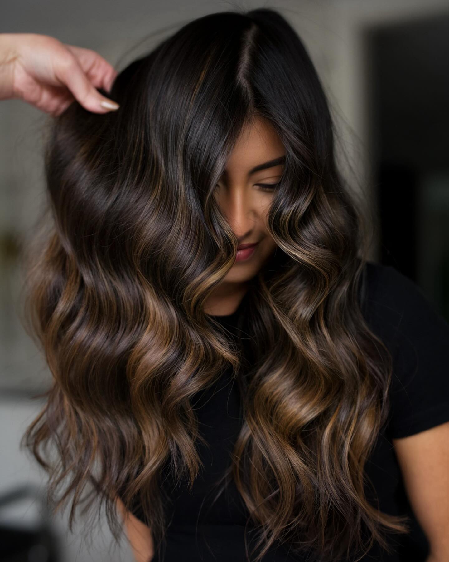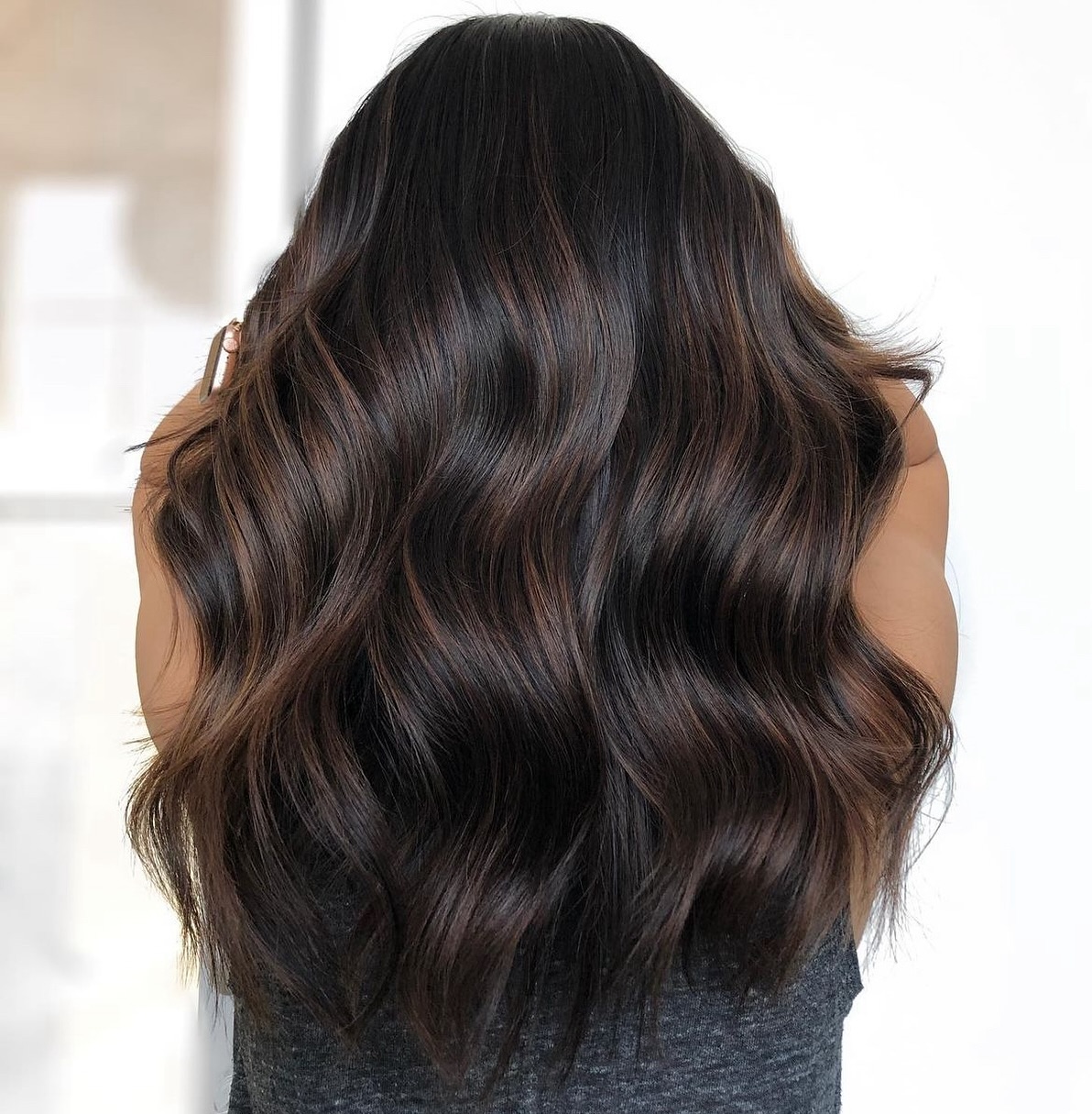 Chocolate brown balayage becomes even more gorgeous when set off by darker espresso brunette. Wavy locks look like a waterfall of soft color when worn down – loose and flowing.