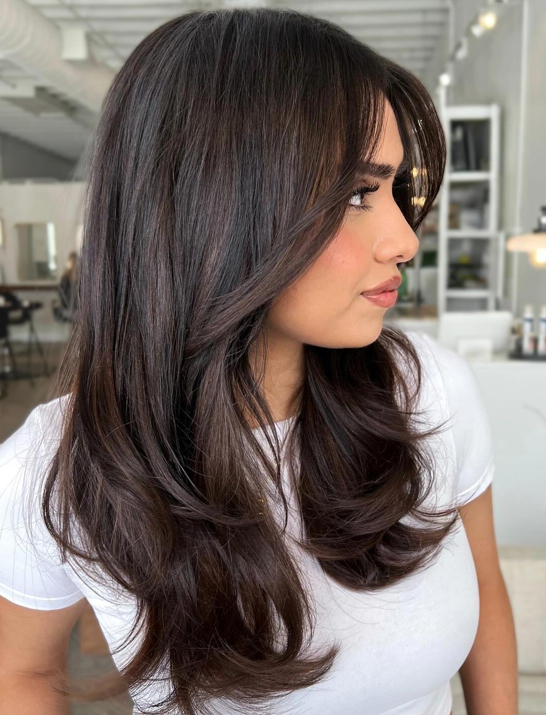 These gorgeous colors are a perfect way to do cool-toned dark chocolate hair with highlights. Ask your stylist for a medium cut with just a few chin-length layers. You’ll have so many modern ways to style this cut: perfectly straight, curled under layers, or large waves.