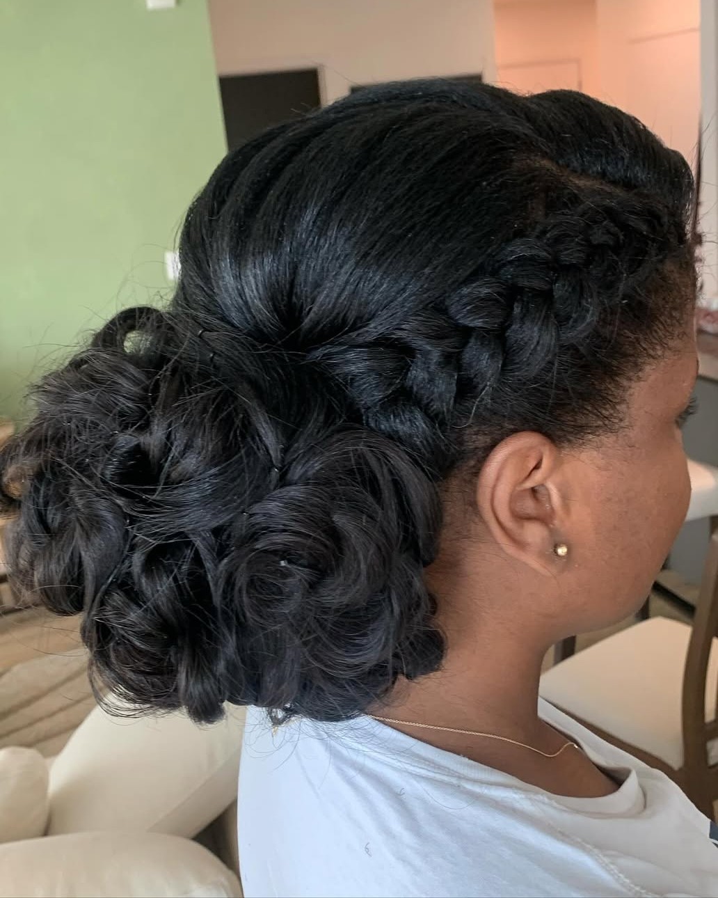 A lot of updos for natural hair focus on braids or twists, but this one lets the curls be the star. The well-placed braids on the side of the head help break up the curls with a unique touch.