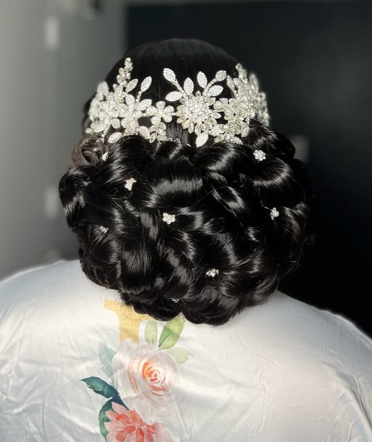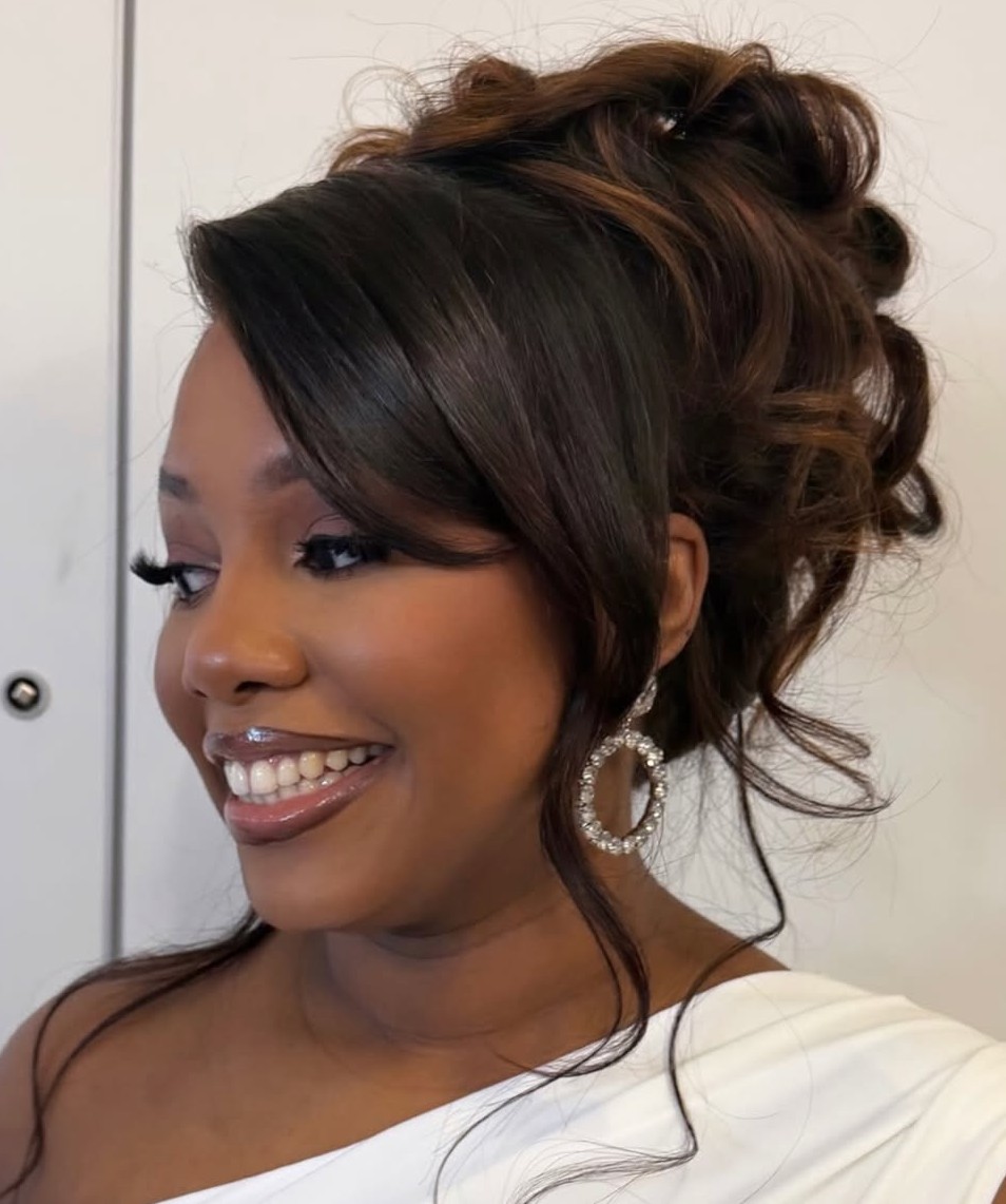 This sleek, low puffy ponytail is a great option for brides and bridesmaids alike. It’s fun and easy to do if you’re the kind of bride that has her heart set on doing her own hair. This style can be achieved on relaxed or natural hair, with or without extensions.