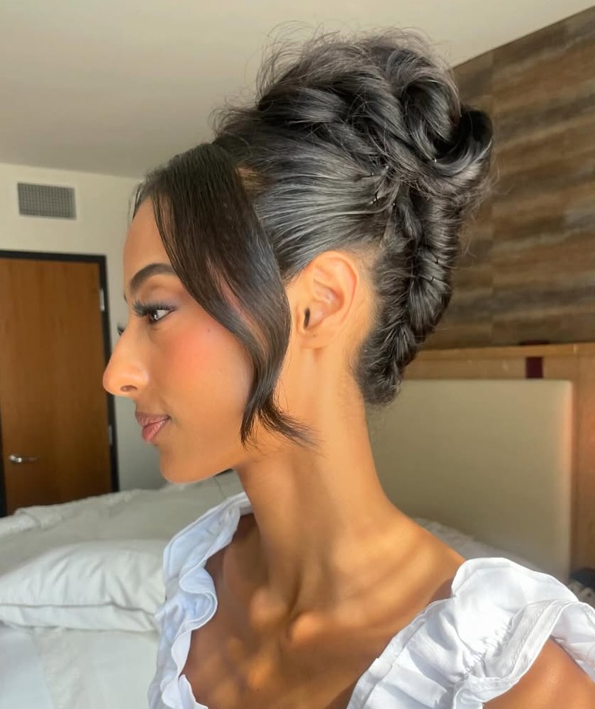 There are a few different eye-catching elements going on with this updo, but everything ties together. Her hair has been pinned back into a low bun. A few front layers were braided while some other tendrils were curled and left loose. A hair accessory completes the look.