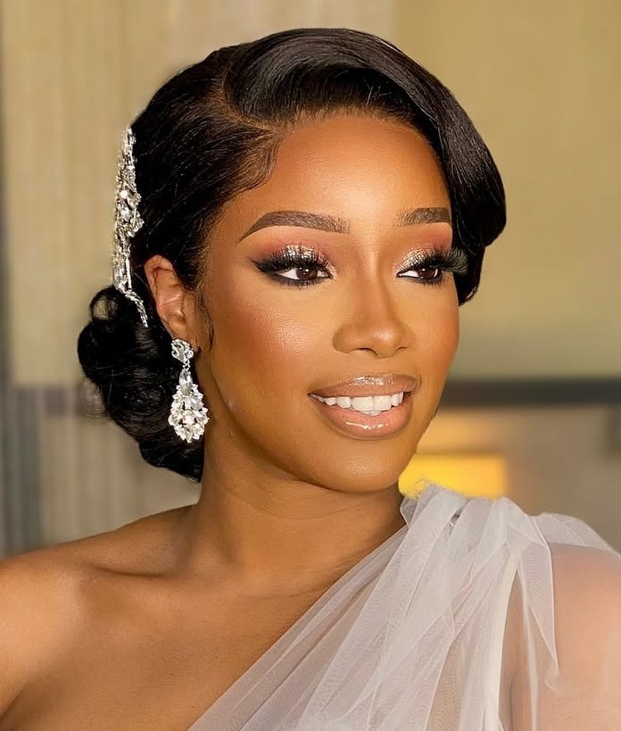 Glamor and elegance are not just for medium-length or long hair. This style is great for those with tapered cuts and creates the illusion of a perfect updo. Add your accessories and voila, the perfect bridal hairstyle for the perfect bride.