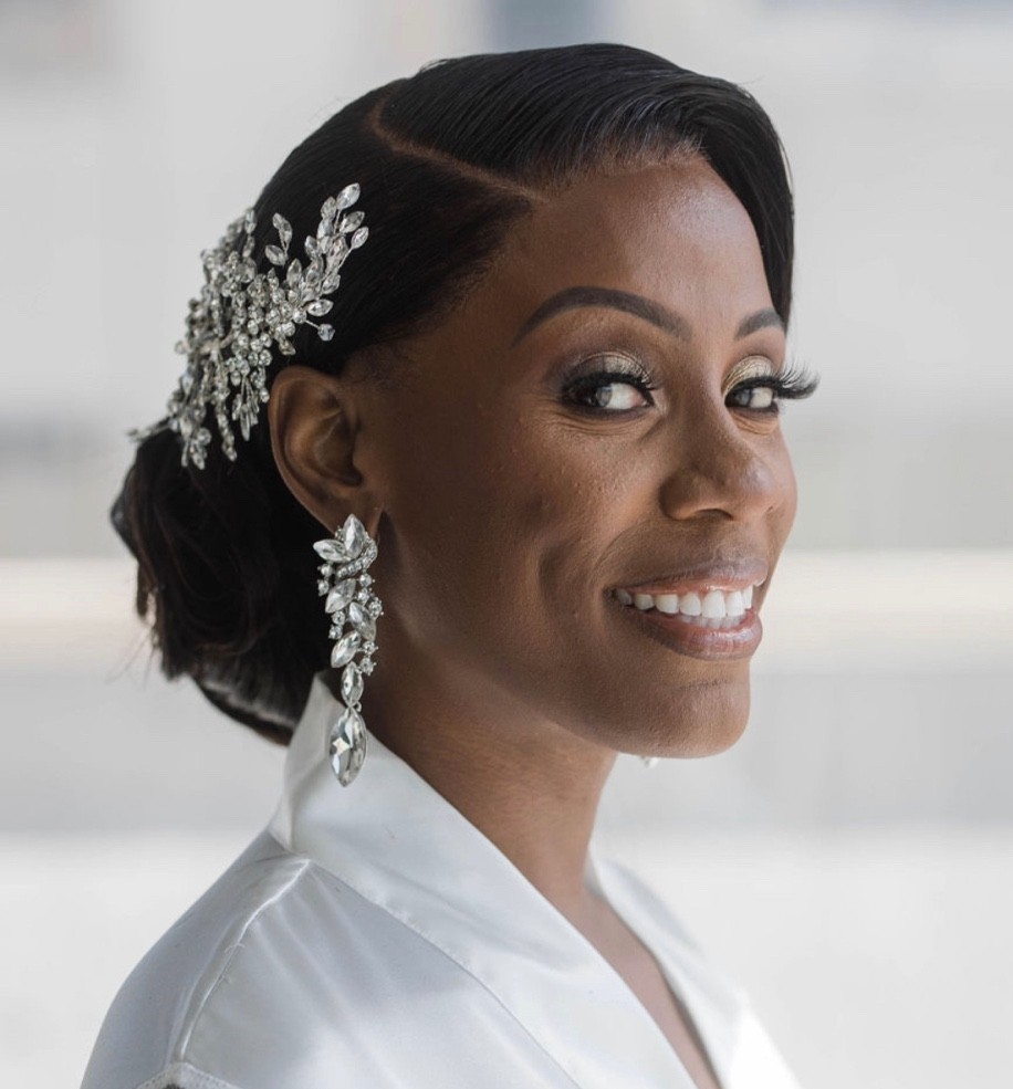 This sleek, low puffy ponytail is a great option for brides and bridesmaids alike. It’s fun and easy to do if you’re the kind of bride that has her heart set on doing her own hair. This style can be achieved on relaxed or natural hair, with or without extensions.