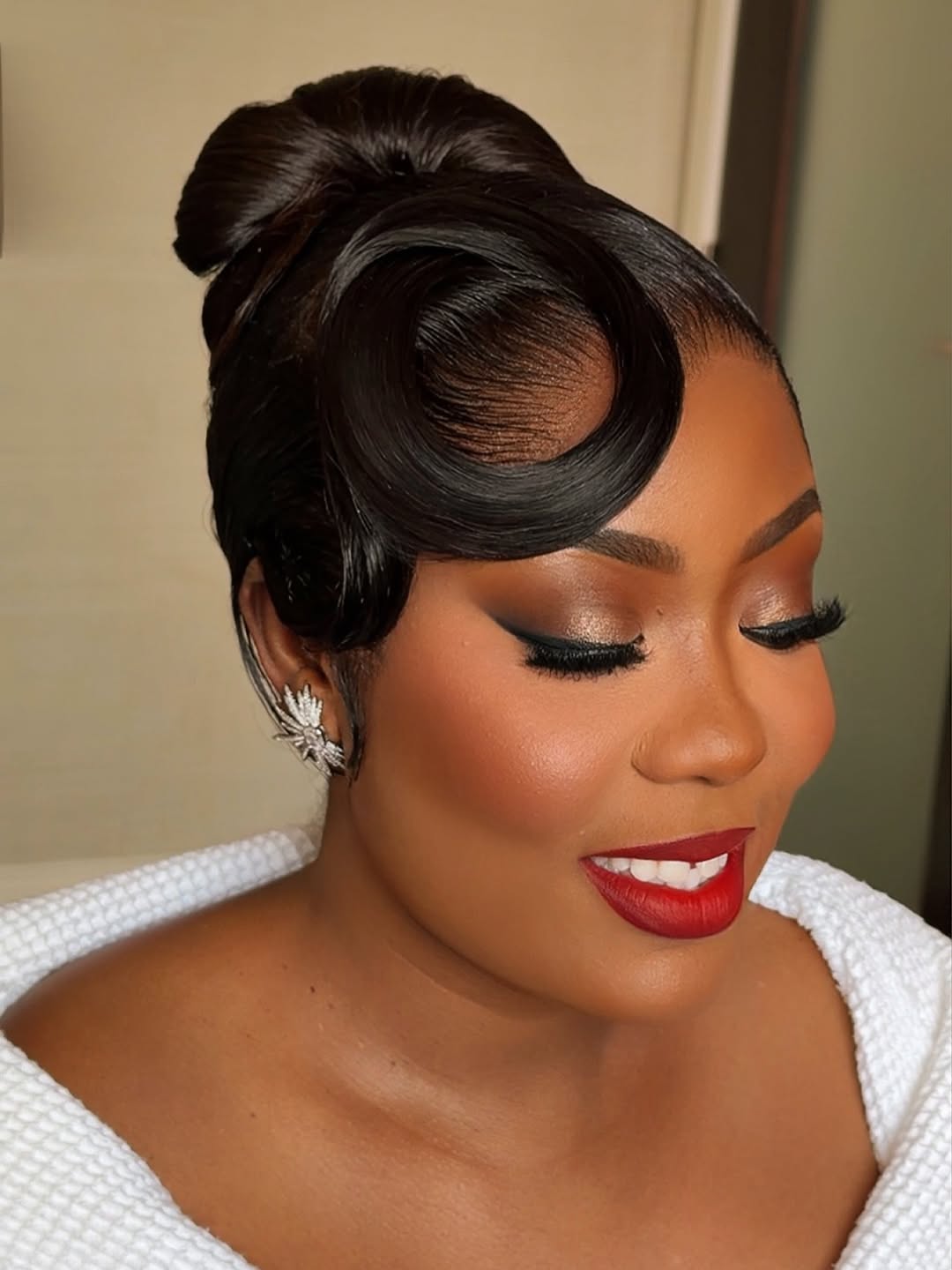 If you have chemically straightened your hair or wear a weave, try this look on your big day. Super sleek hair swirled into perfect circles gives a glamour retro feel. The jeweled hair clip adds a bit of bling to the elegant updo.