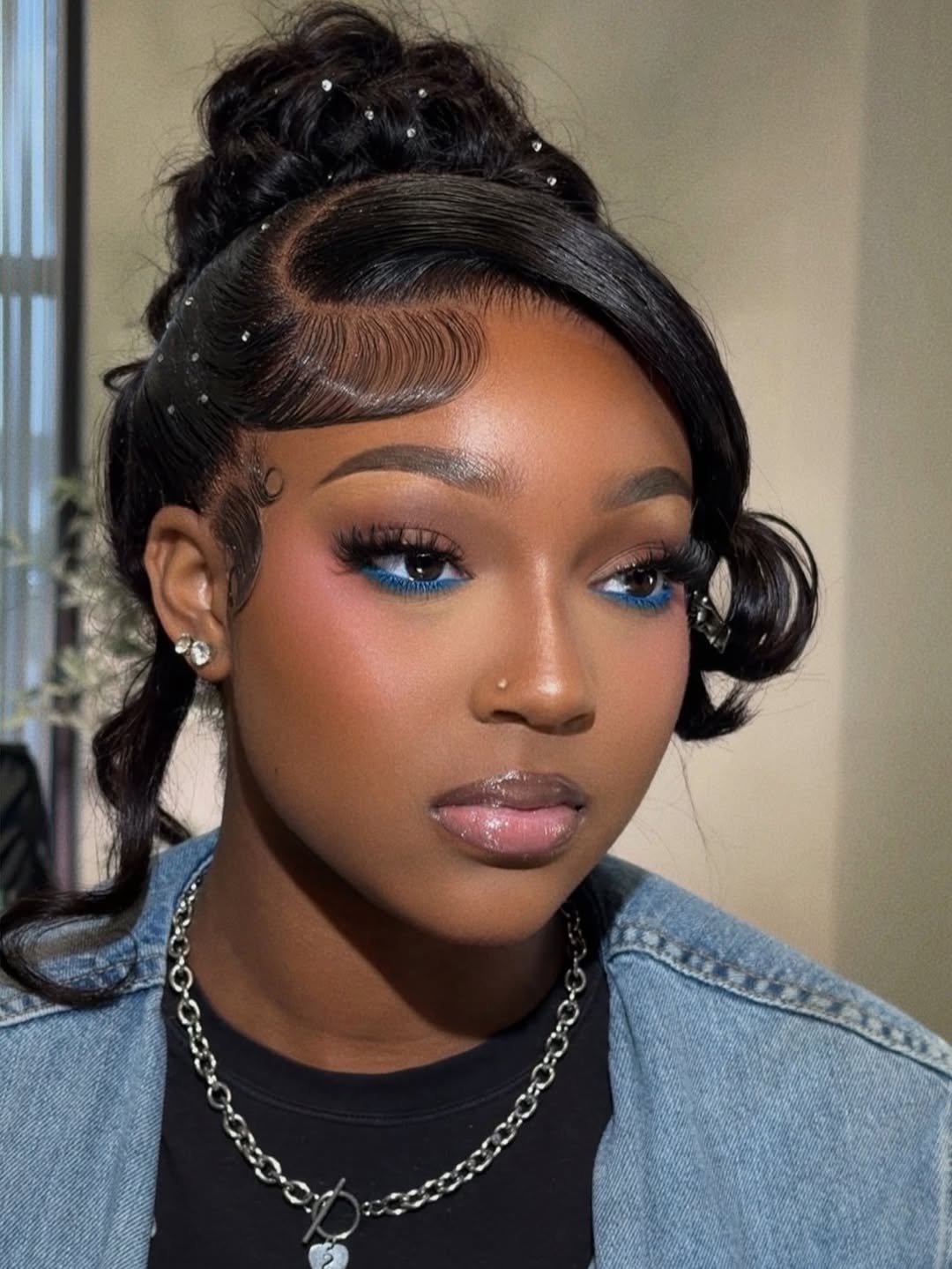 While many women use box braids as a protective style in the summer, they can also be worn as a fun look all year long. The thick style allows you to make a full bun that can be easily accented with a jeweled band and veil. With no hair in your face, a high bun will let your beautiful makeup truly shine.