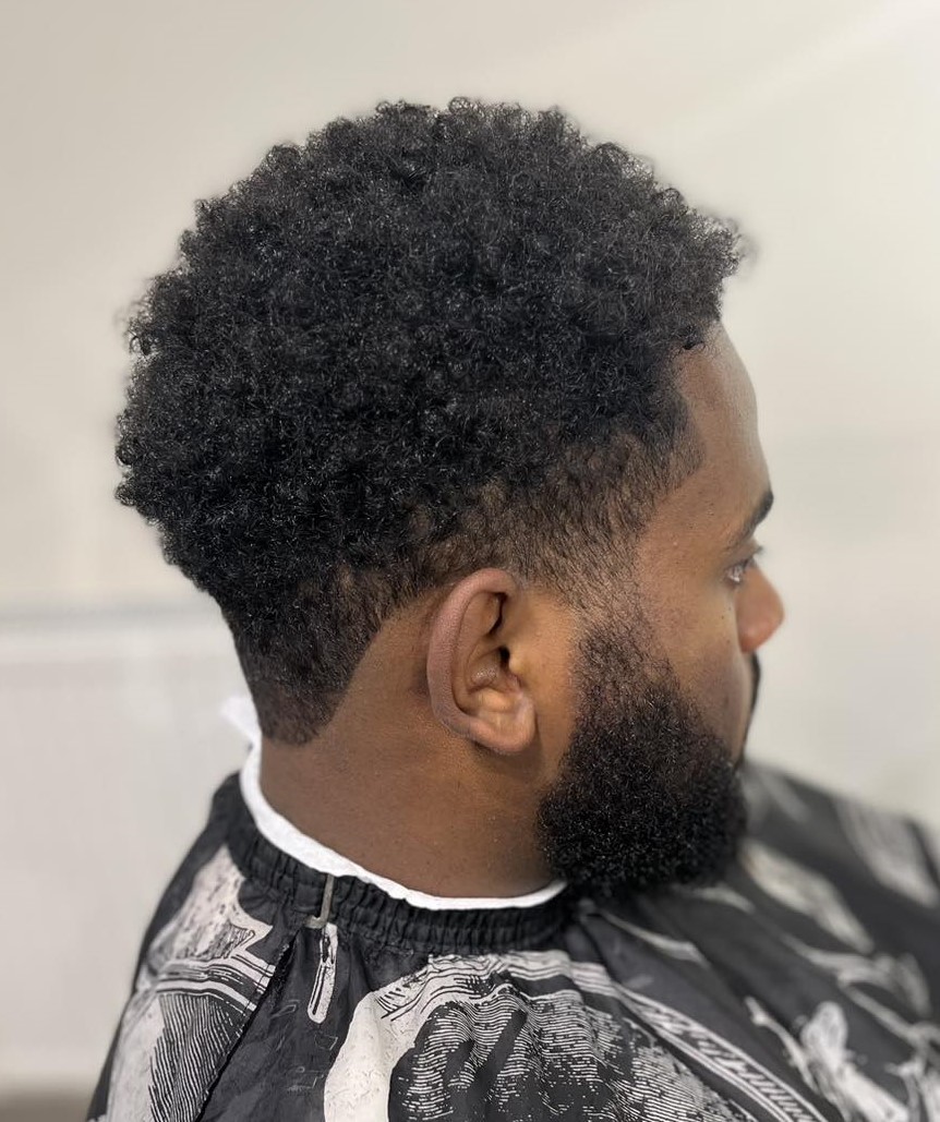 This hairstyle celebrates natural texture with a smooth, rounded shape, a blurred fade, and a crisp line-up. Polished and cut to perfection, the high-top fade features a precise line-up that seamlessly connects to the beard.