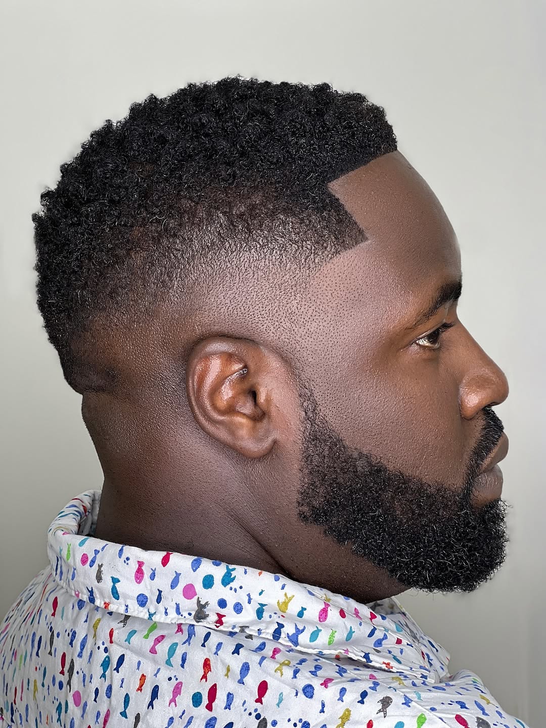 This hairstyle celebrates natural texture with a smooth, rounded shape, a blurred fade, and a crisp line-up. Polished and cut to perfection, the high-top fade features a precise line-up that seamlessly connects to the beard.