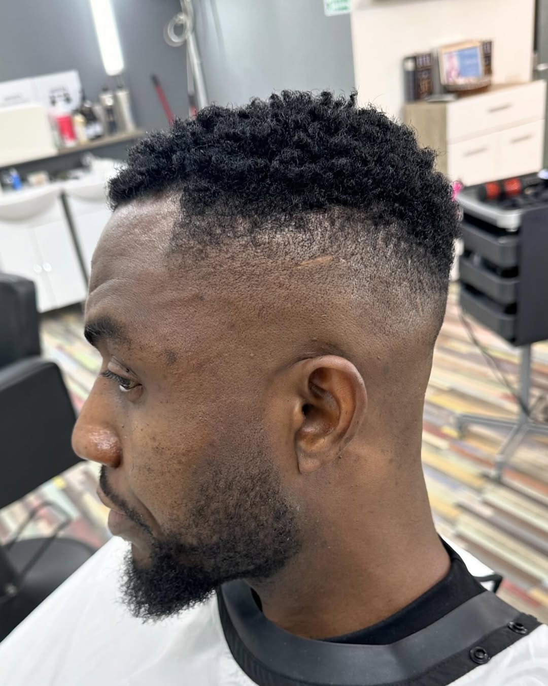 If you want something modern but uncomplicated, incorporate a fade and line up into your hairstyle. Work with what nature has given to you – accentuate the jaw corners with a facial hairstyle and add cute sponge twists on top for a fun texture.