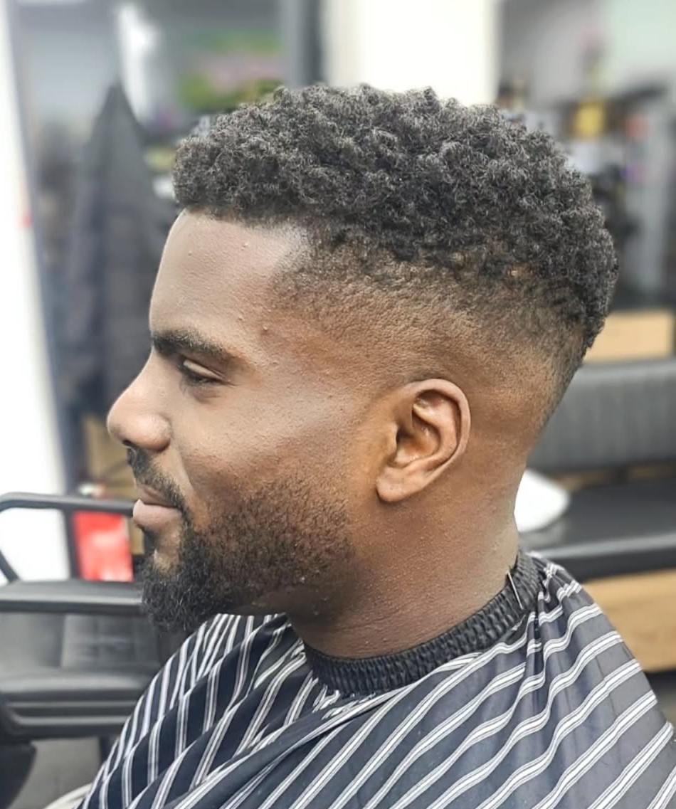 Curly hair can be shown off even in very short hairstyles. Let the curls thrive on the top and keep the sides neat and polished with a high fade. Use a side part to distinguish the two sections if you want a sharper look or let them blend seamlessly.