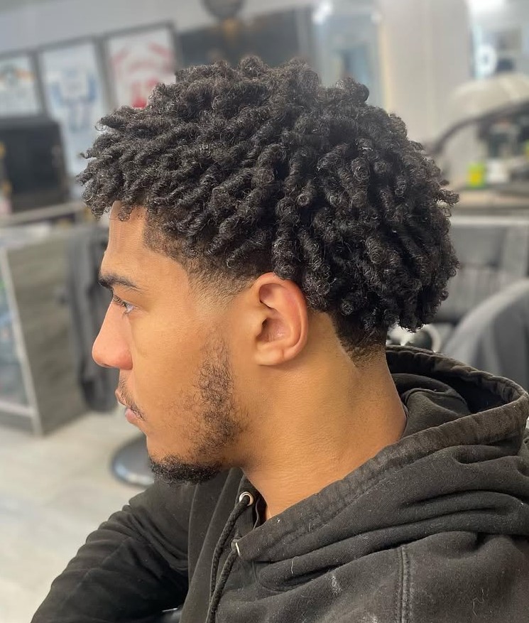 If you want something modern but uncomplicated, incorporate a fade and line up into your hairstyle. Work with what nature has given to you – accentuate the jaw corners with a facial hairstyle and add cute sponge twists on top for a fun texture.