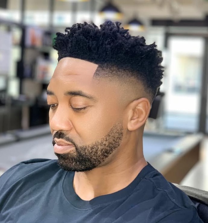 If you want something modern but uncomplicated, incorporate a fade and line up into your hairstyle. Work with what nature has given to you – accentuate the jaw corners with a facial hairstyle and add cute sponge twists on top for a fun texture.
