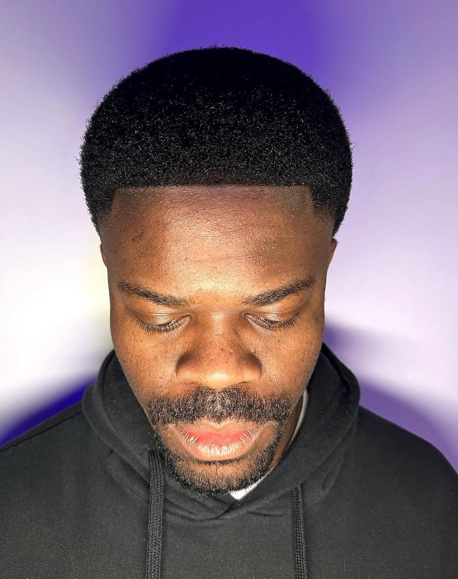 Let the complete crop grow out a little longer than you are used to and ask your barber to define the shape of your head, preserving the length. Dense tight coils in this case will stick out up and to the sides but with the defined shape. It’s a big plus and a cool look.