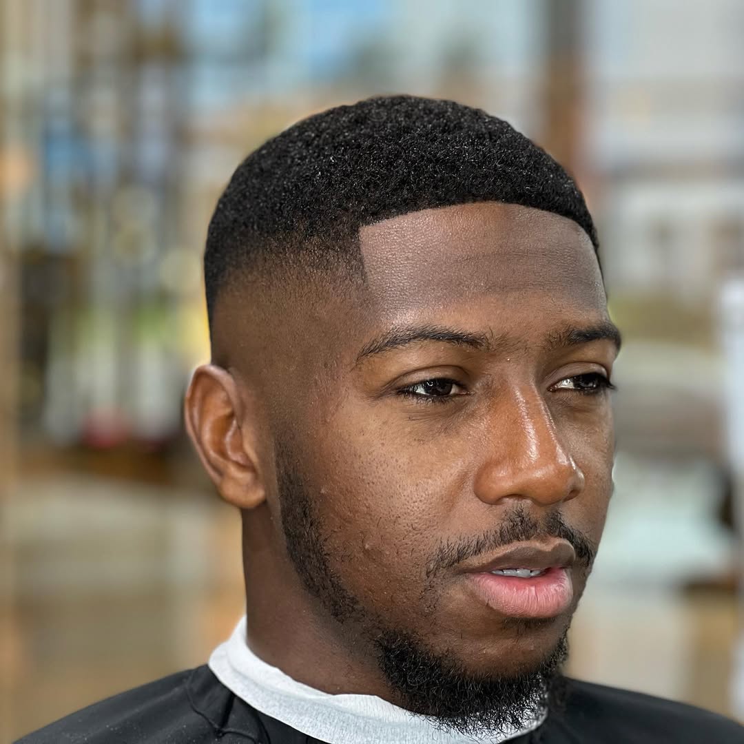 This hairstyle celebrates natural texture with a smooth, rounded shape, a blurred fade, and a crisp line-up. Polished and cut to perfection, the high-top fade features a precise line-up that seamlessly connects to the beard.