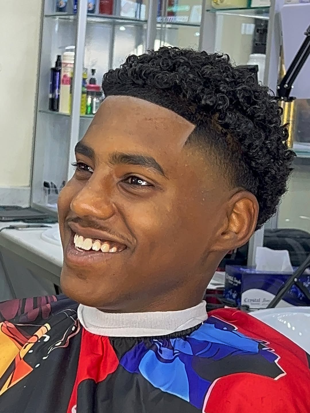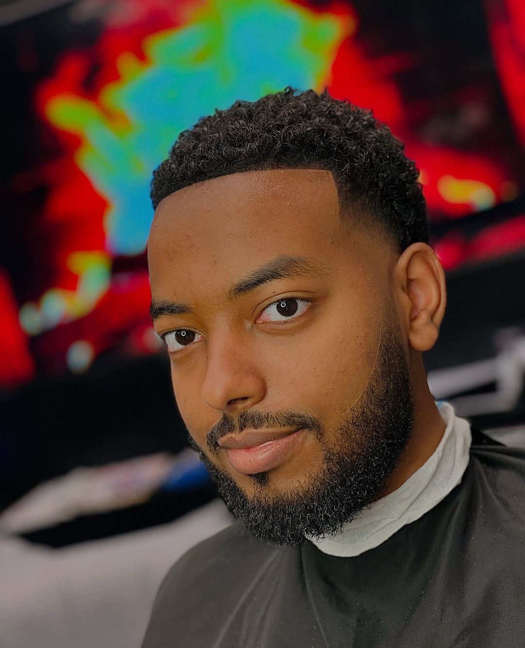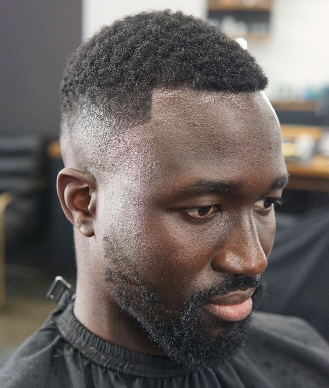 This hairstyle celebrates natural texture with a smooth, rounded shape, a blurred fade, and a crisp line-up. Polished and cut to perfection, the high-top fade features a precise line-up that seamlessly connects to the beard.