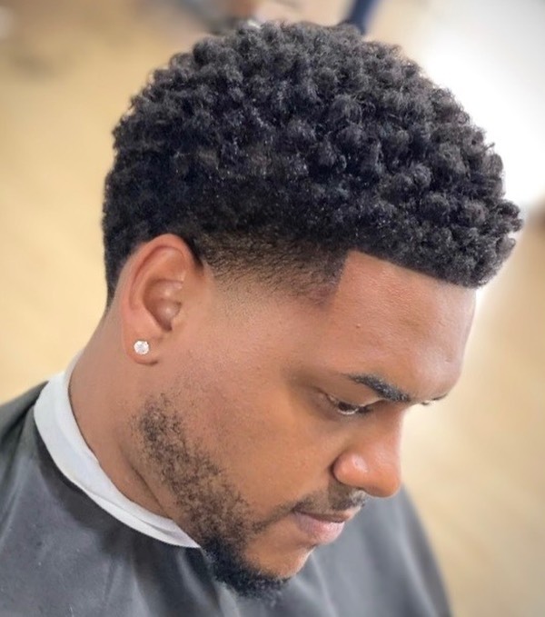 Professional although not classic, the fade with curls creates a dapper look. There is still enough length to show off the natural locks, while the low fade creates a diagonal line that runs from the temple to the nape. It results in a more interesting shape – which is complimented by the beard.
