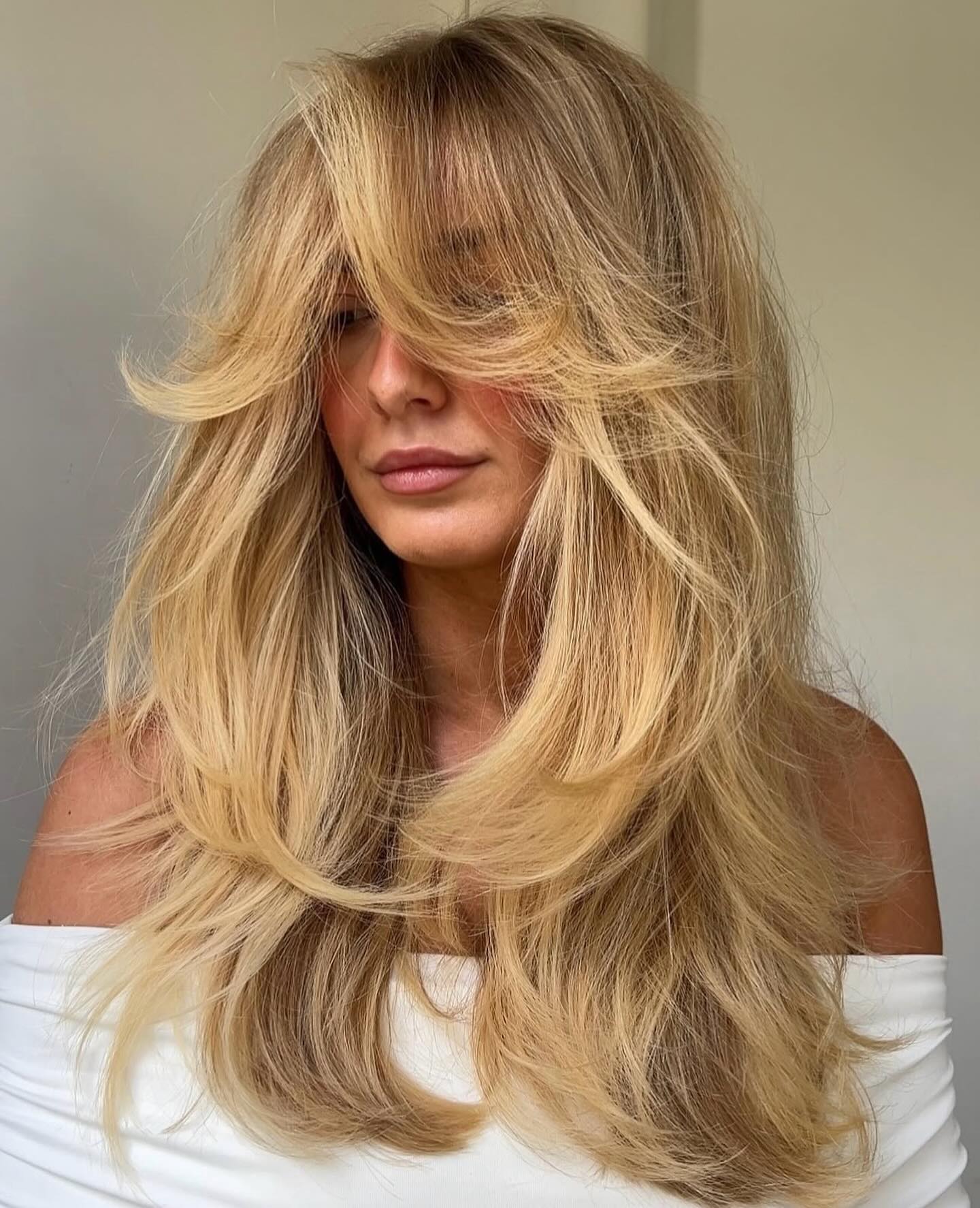 This look exudes ‘girl-next-door’ charm, perfect for those who crave laid-back elegance. To recreate it on your hair, go for a cute long shag cut, the easygoing texture of flippy layers, and a delicious strawberry blonde balayage.