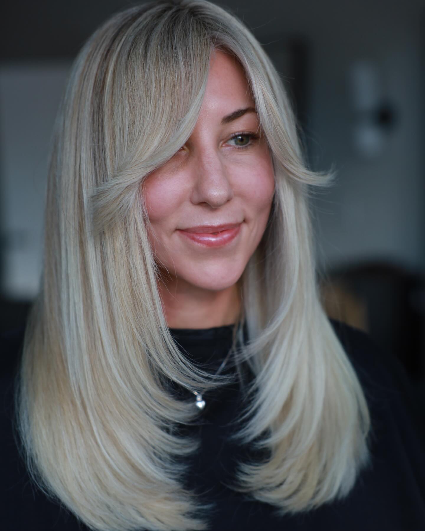 The avant-garde hue and diffused edges transform this classic long layered hairstyle into something distinctive and futuristic. The glossy gray and thinned ends that flow seamlessly create an effect reminiscent of liquid metal. The subtle asymmetry of a side part is the perfect finishing touch.