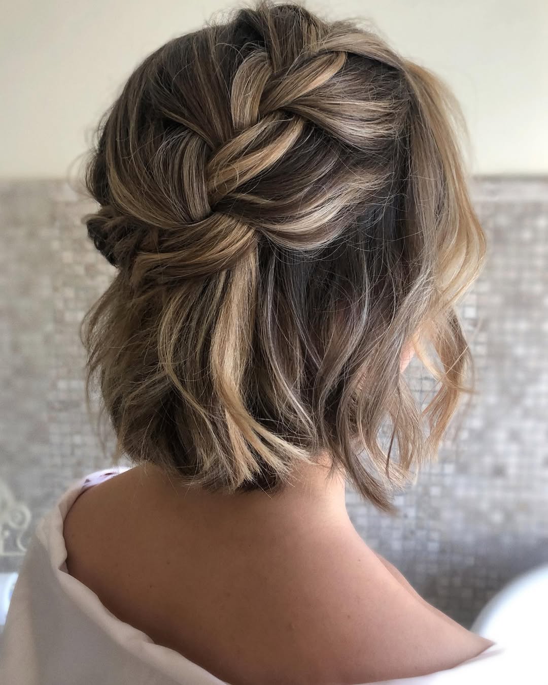 You can wear a half up half down wedding hairstyle even on chin-length hair. Loose waves and braids look especially cute on short locks.