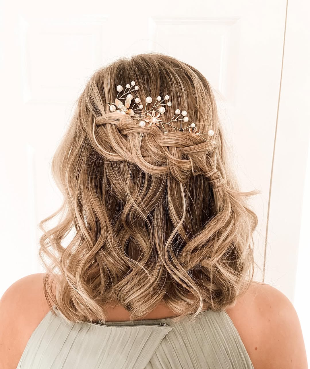You can wear a half up half down wedding hairstyle even on chin-length hair. Loose waves and braids look especially cute on short locks.