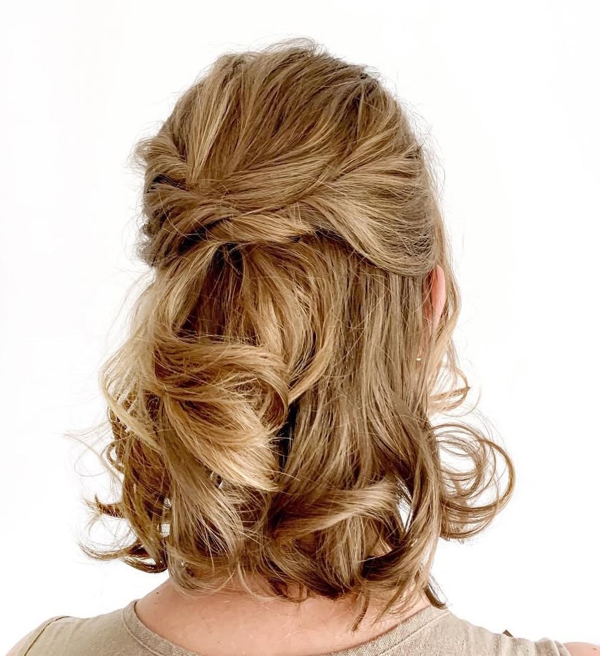 You can wear a half up half down wedding hairstyle even on chin-length hair. Loose waves and braids look especially cute on short locks.