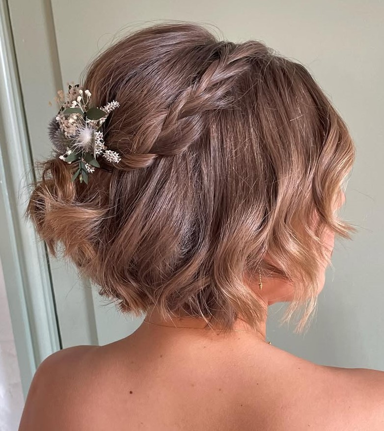 You can wear a half up half down wedding hairstyle even on chin-length hair. Loose waves and braids look especially cute on short locks.
