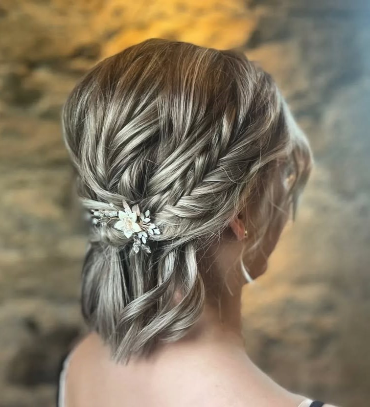 You can wear a half up half down wedding hairstyle even on chin-length hair. Loose waves and braids look especially cute on short locks.