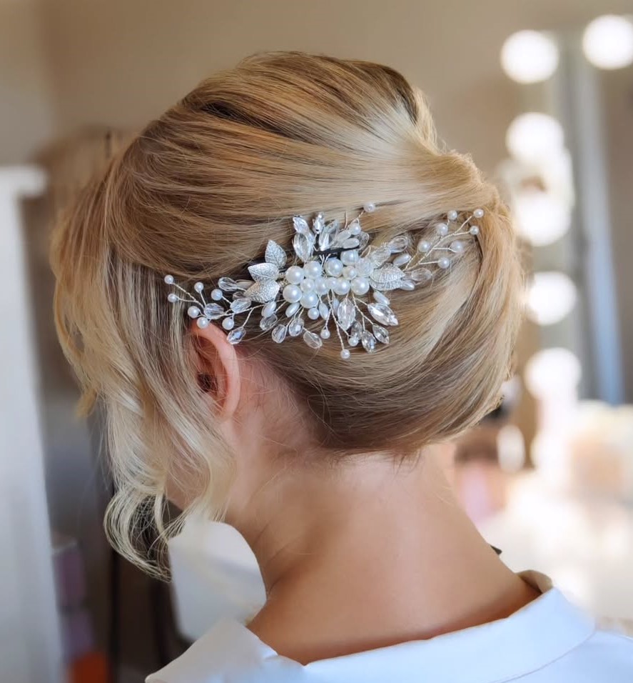 Brush hair back and then backcomb it further with a hair pick or wide toothed comb. Don’t over style – just go where the sections lay, finger combing them into place and pinning them. Add a strong hairspray for all-day hold and lace a back section with a delicate accessory, a piece of baby’s breath or another kind of small, subtle flower.