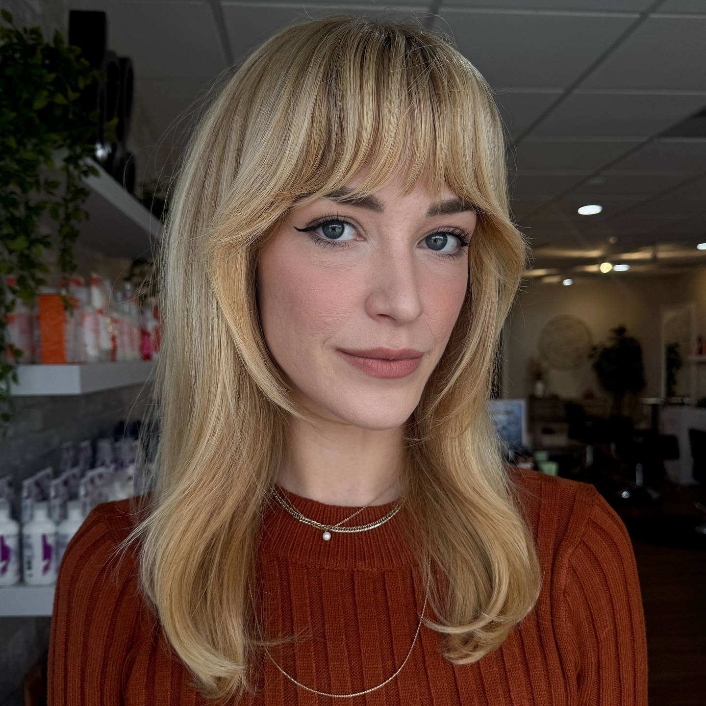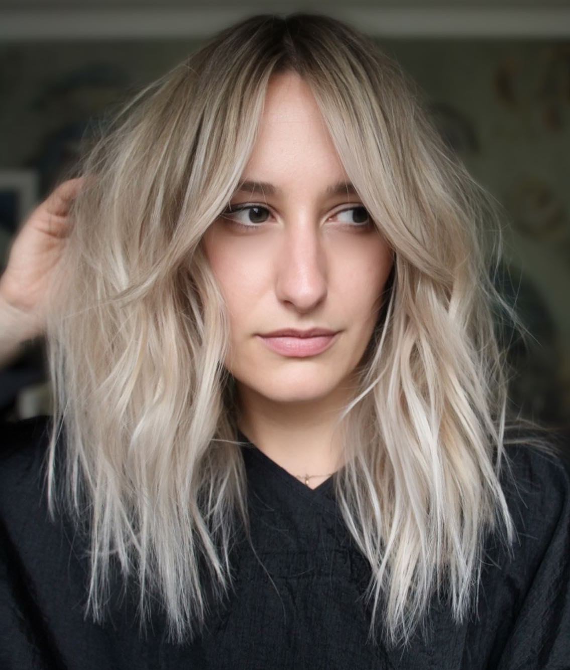 Bangs aren’t always necessary to flatter the face, as this example shows. A razored blonde lob can build body around your face and look effortlessly chic, especially if you ask your hairdresser to put in some extra feathered face-framing layers.