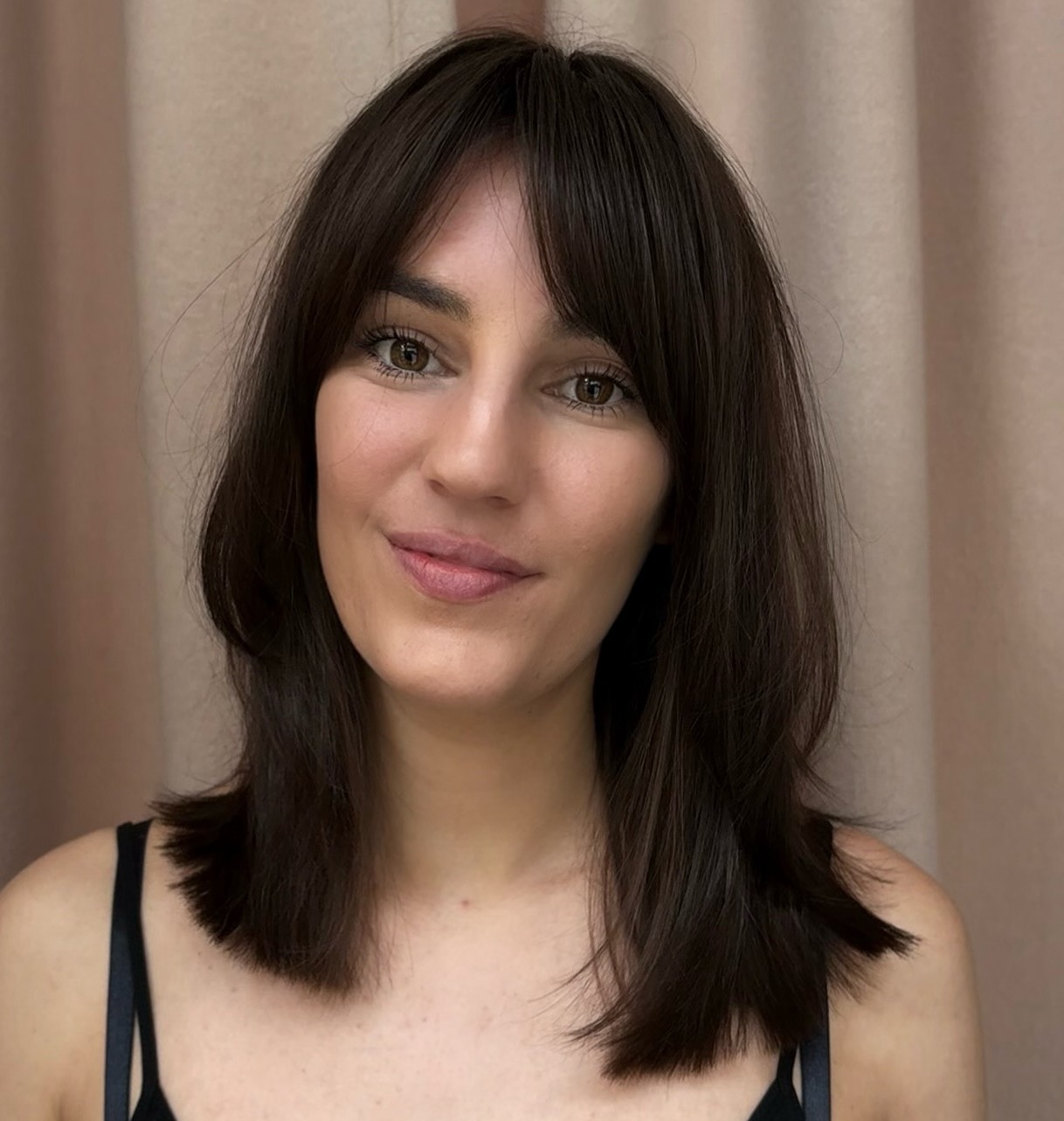 Straight graduated haircuts with layering from the mid-ear section work for expansion, not elongation. In combination with bangs like these you have all the chances to make your oblong face appear a perfect oval.