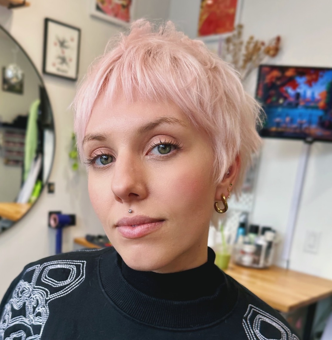 Short fine hair can be difficult to style when it comes to counterbalancing a long face. If you opt for an off-center parting without bangs, this haircut will frame your face without looking too severe and unnatural.