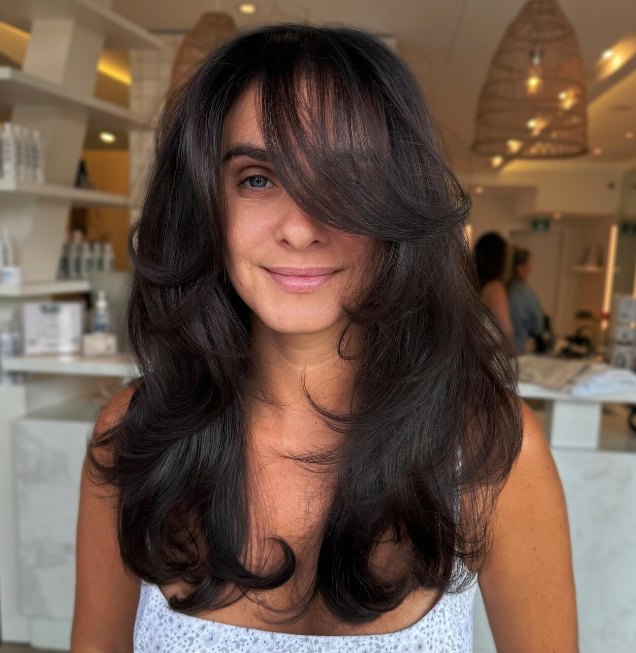 One way to style your hair is to create voluminous curls or waves for more texture and movement. But if that’s not your style and you love straight hair, then try a longer layered look with bangs. Ask your stylist to point cut these straight bangs at the ends instead of cutting them bluntly.