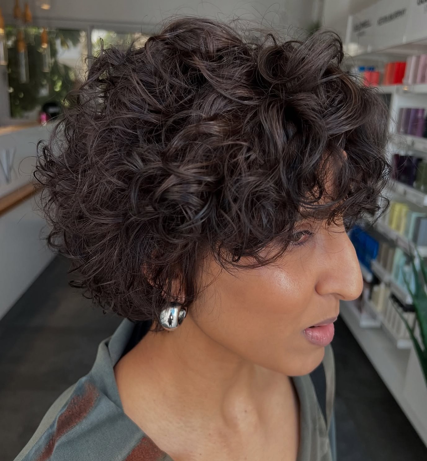 This heavy-layered modern shag haircut gives major volume and frames the face. A double-win for you! Complement your look with a flirty fringe to make your curly shag even more eye-catching.