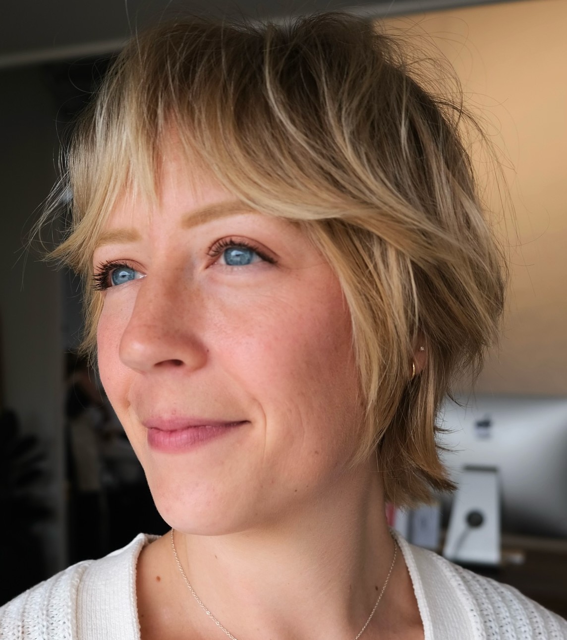 If you have a high forehead, consider this shaggy bob. The deep side parting provides a lot of volume on one side to balance out the length of the face and gives off a messy and carefree appearance.